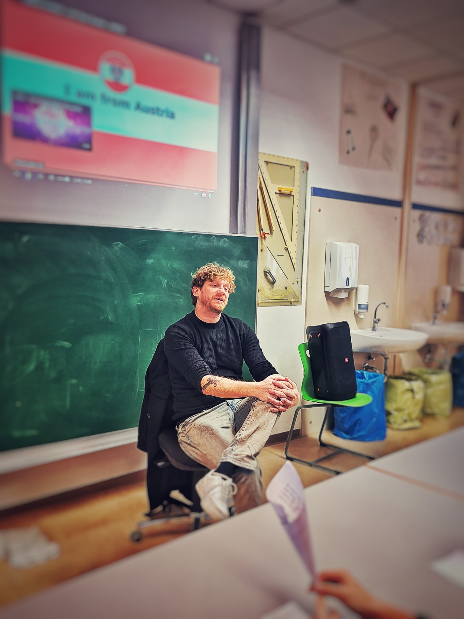 Zur Begrüßung empfingen die SchülerInnen Lucas mit dem wohl bekanntesten Lied seines Vaters, „I am from Austria“. Anschließend durften die Kinder zuvor vorbereitete Interviewfragen an den Musiker stellen. Die SchülerInnen, wie auch LehrerInnen waren begeistert von Lucas‘ offener und ehrlicher Art. Lucas stellte sich tapfer jeder Frage und man merkte, dass nach kurzer Zeit, sowohl die SchülerInnen, als auch Lucas auftauten und immer lockerer wurden. Es war äußerst interessant zu erfahren, wie der Alltag eines Musikers aussieht, wann Lucas‘ musikalische Karriere begann sowie die Art und Weise, wie er Lieder schreibt.