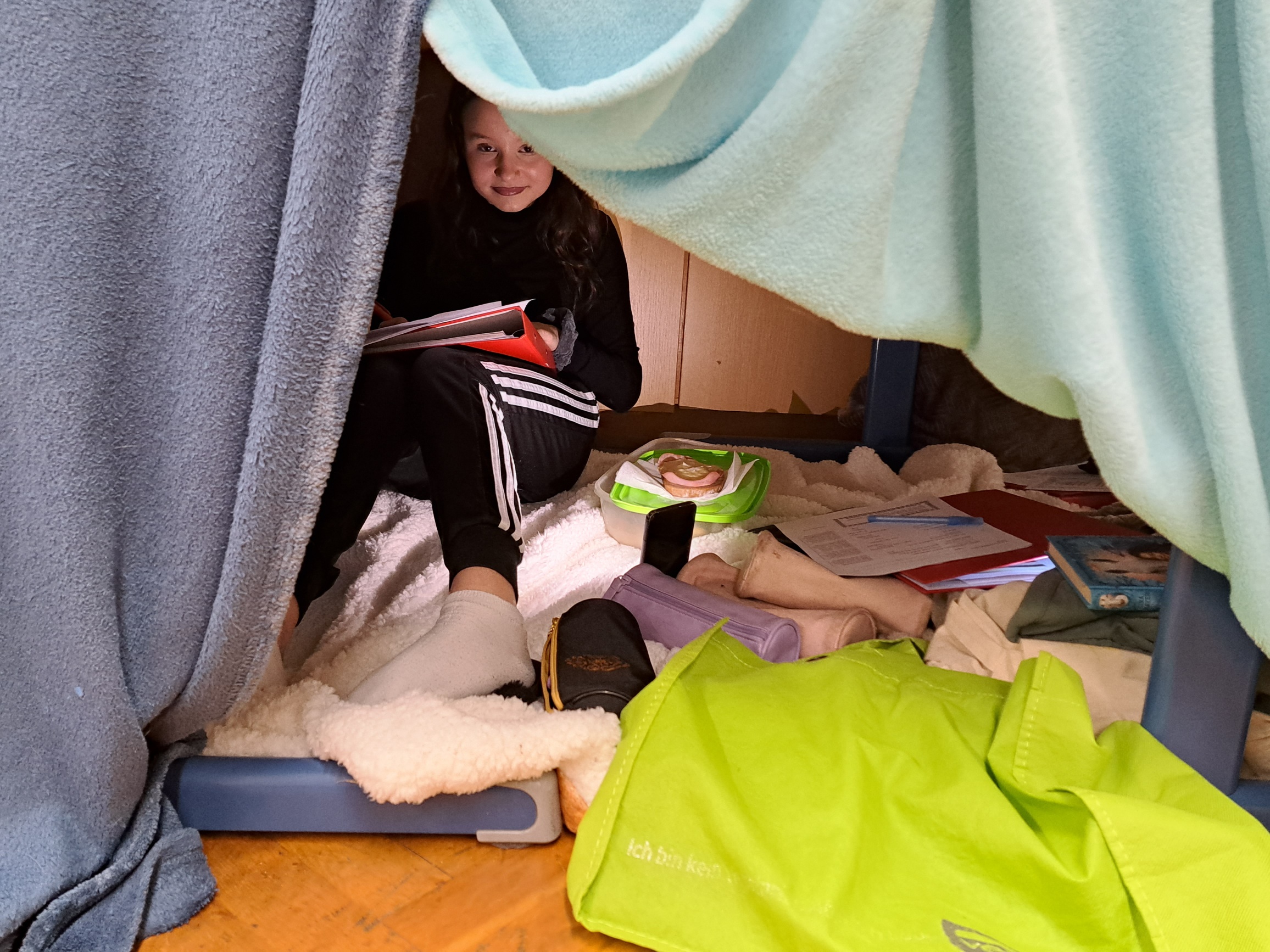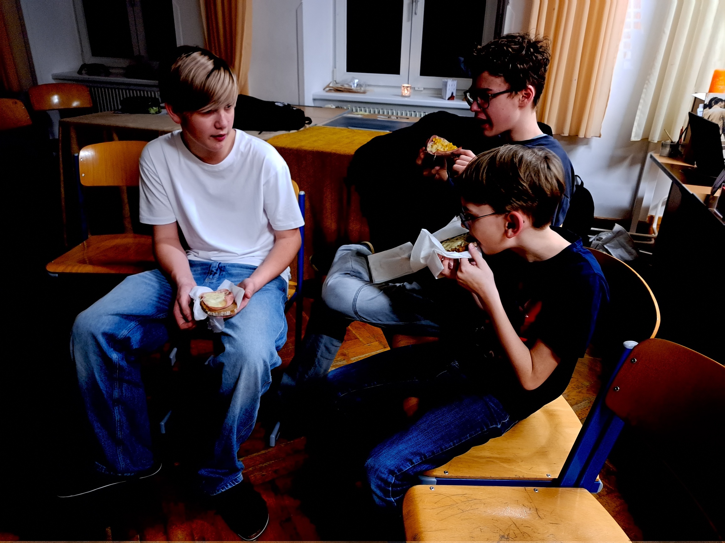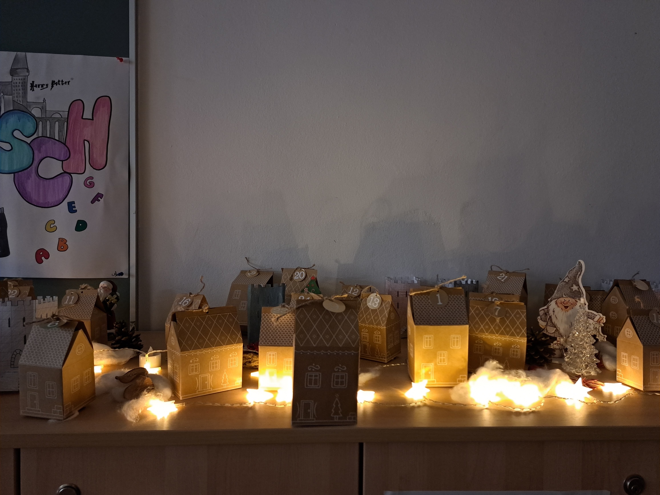 Zwei Wochen vor den Weihnachtsferien gab es für die 3fa einen besinnlichen Weihnachtsleseabend. Es gab überbackene Brote, selbstgemachten Punsch, Tee und natürlich leckere Kekse. Die Schüler bauten sich Höhlen, in denen sie mit Taschenlampen Weihnachtsgedichte und in ihren Lieblingsbüchern lesen konnten. Als Abschluss geisterten wir mit unseren Lampen durch die finstere Schule. Die Schüler waren begeistert und wünschten sich gleich eine Wiederholung im kommenden Schuljahr.