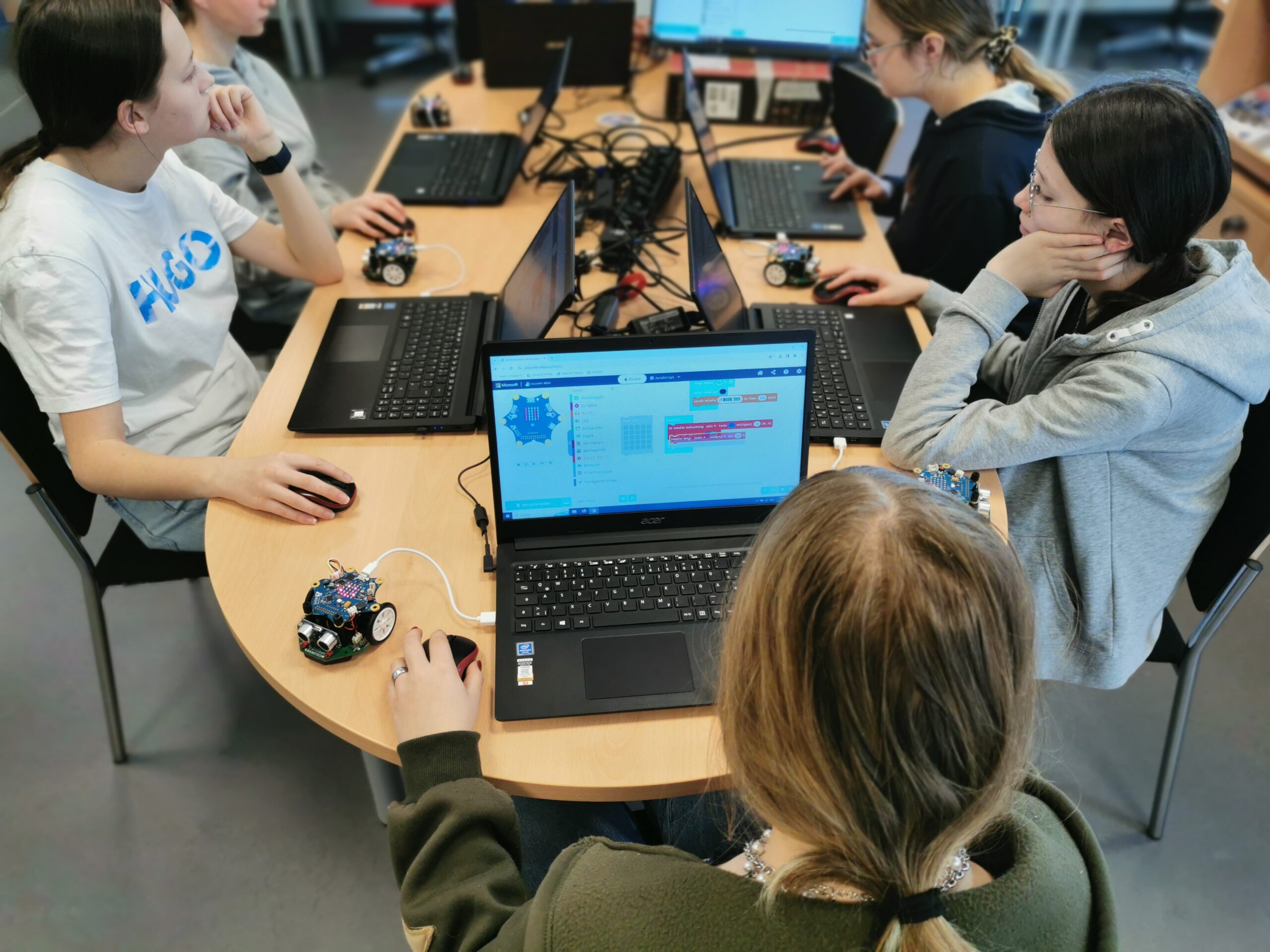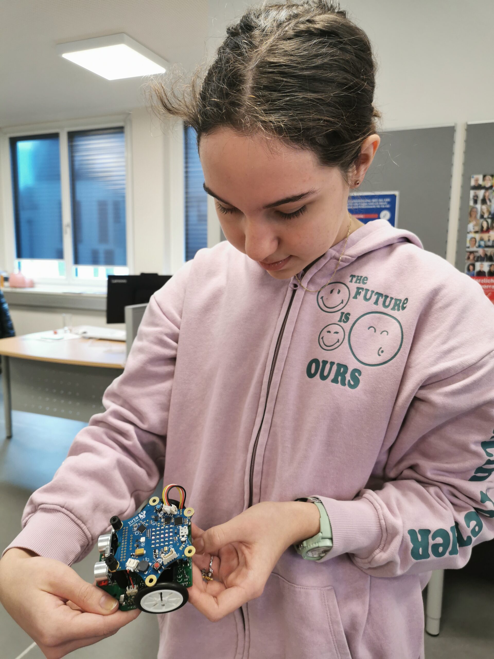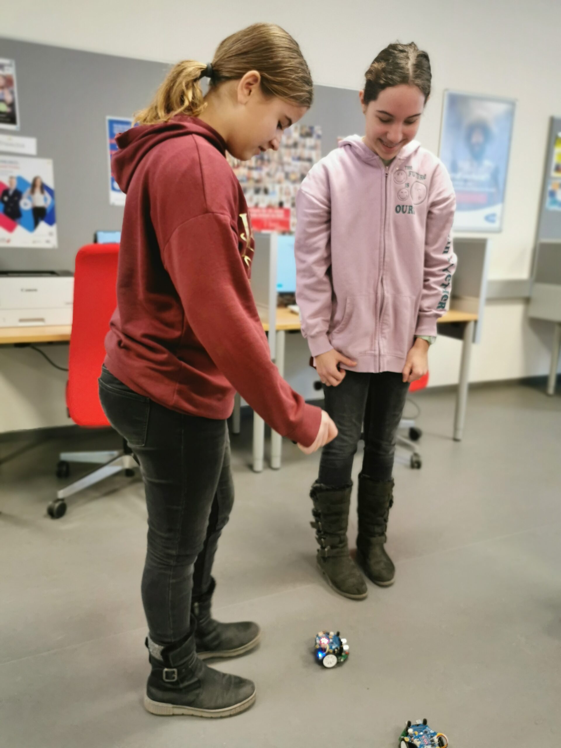 An der digitalen Station konnten die Schülerinnen einen Mini-Roboter mithilfe eines Computerprogramms selbst programmieren, sie lehrten ihm das geradeaus fahren und das Fahren um Hindernisse. Außerdem konnten Songs eingespielt und die Roboter digital beschriftet werden.