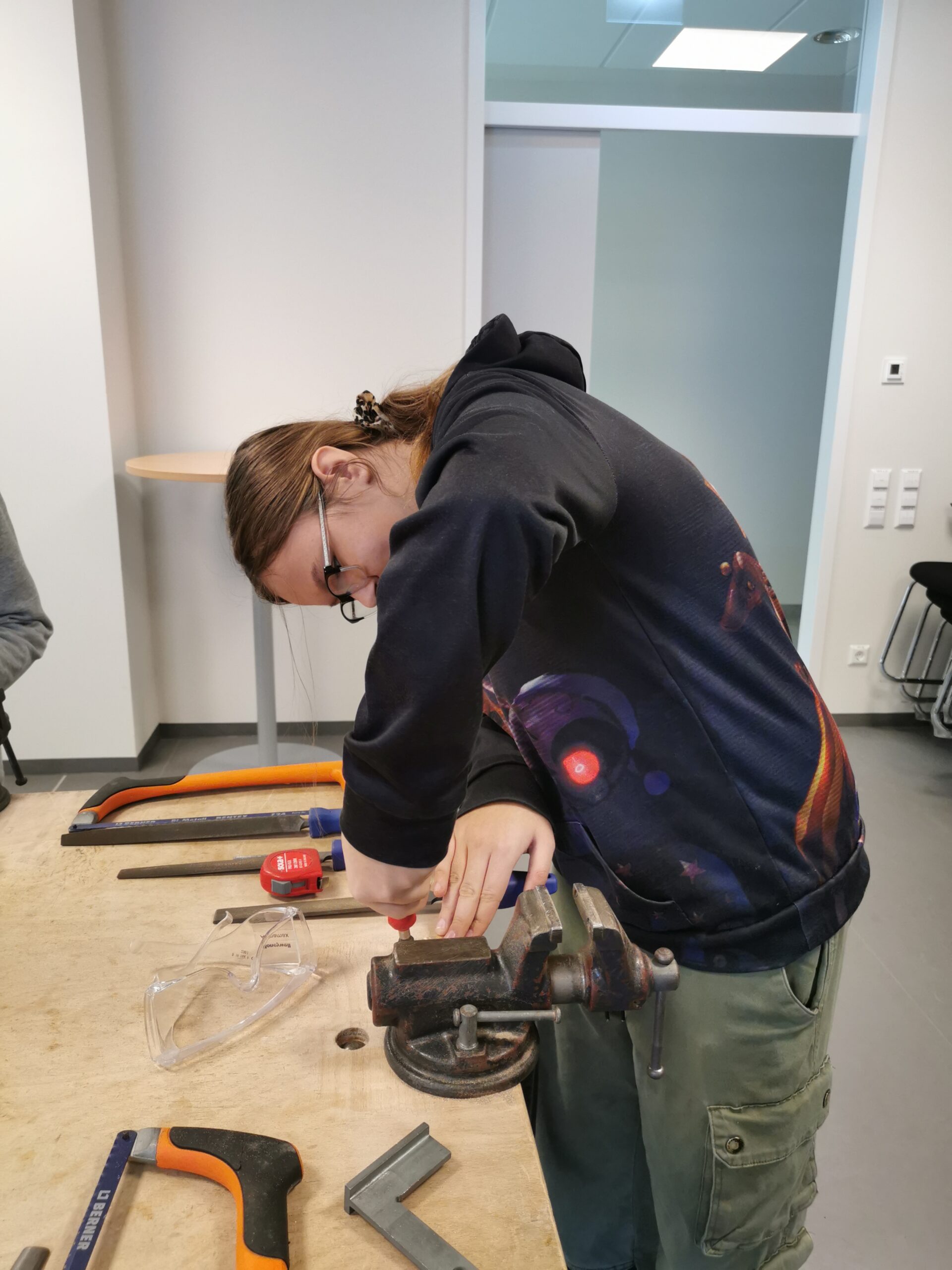 An der Metallverarbeitungsstation konnten die Mädchen ihre eigenen Schlüsselanhänger herstellen, zunächst wurden die Metallstücke in Form gebracht und anschließend noch mit Mustern verziert.