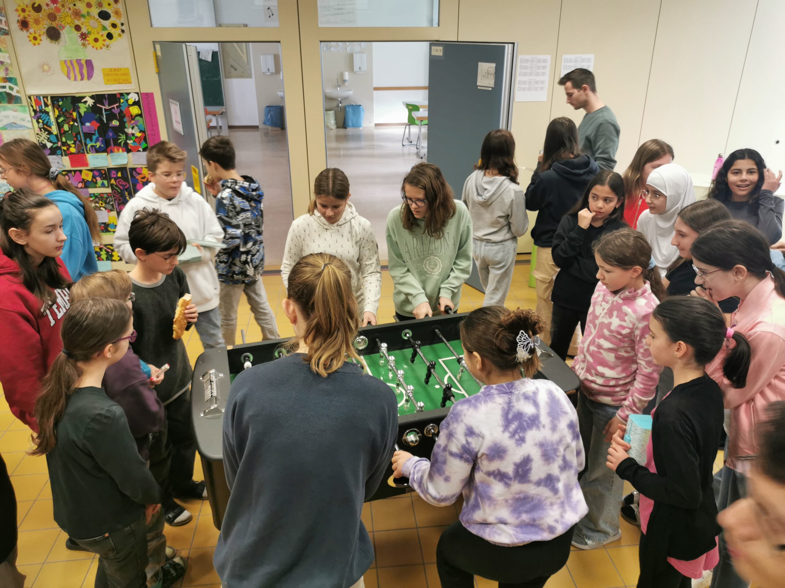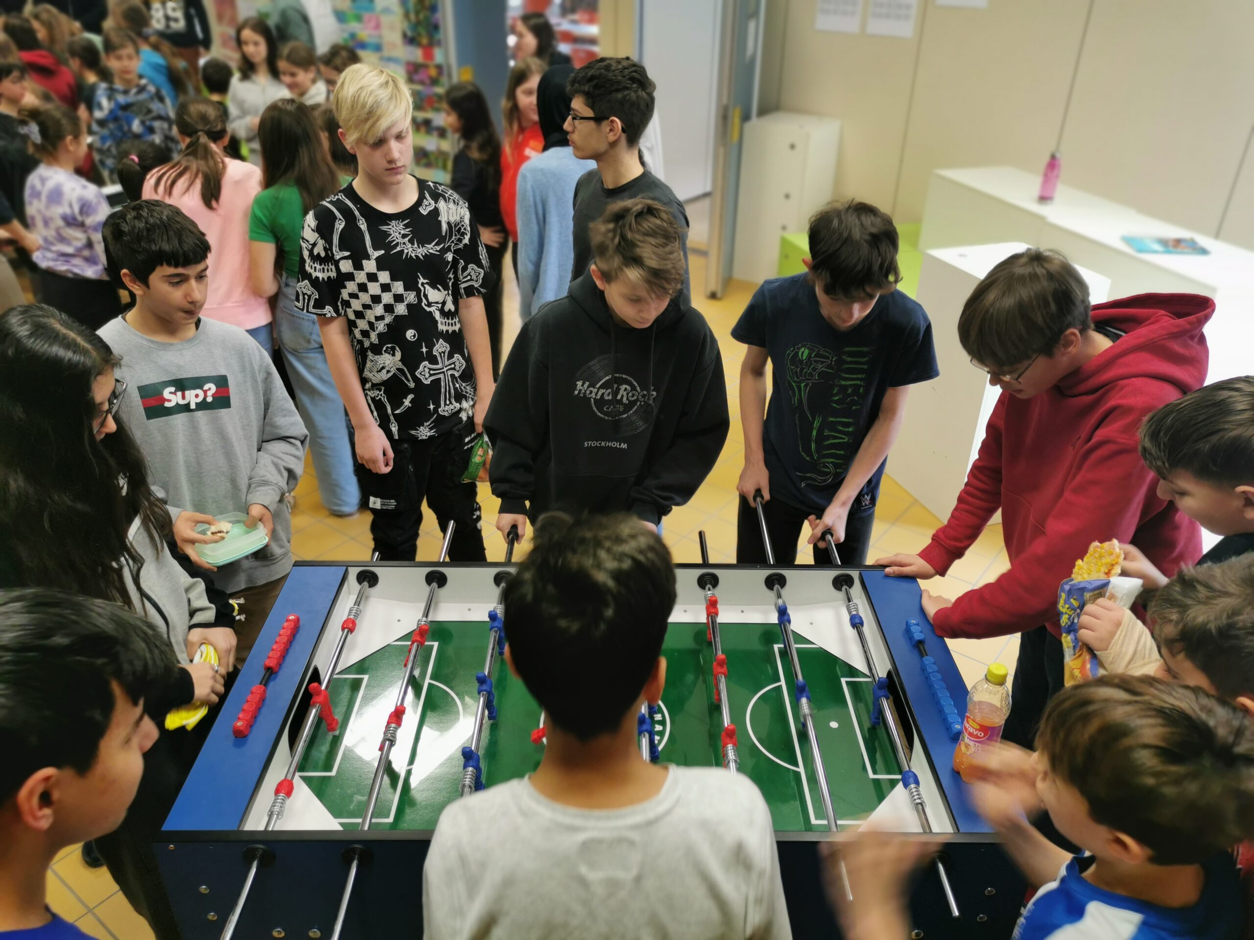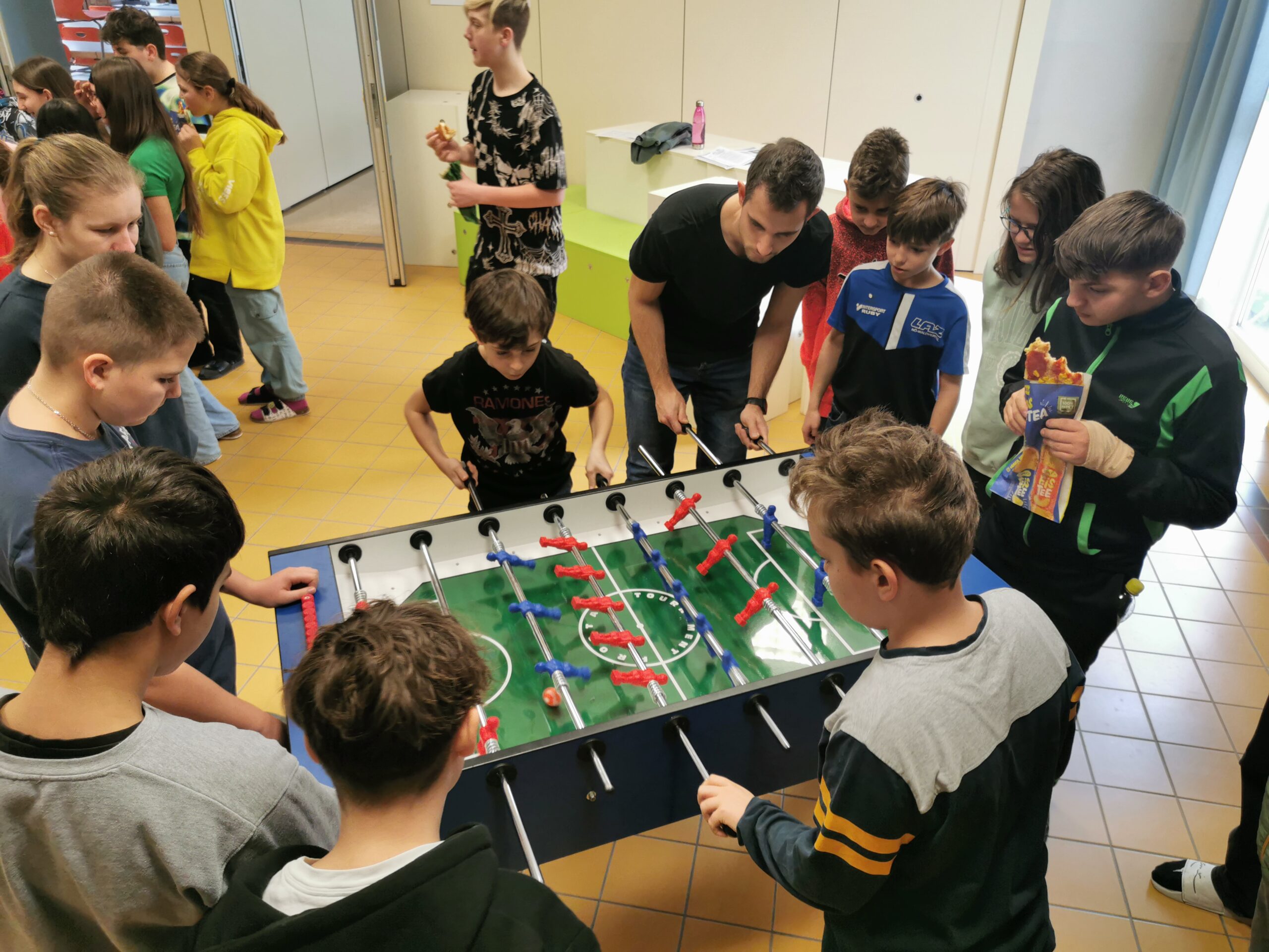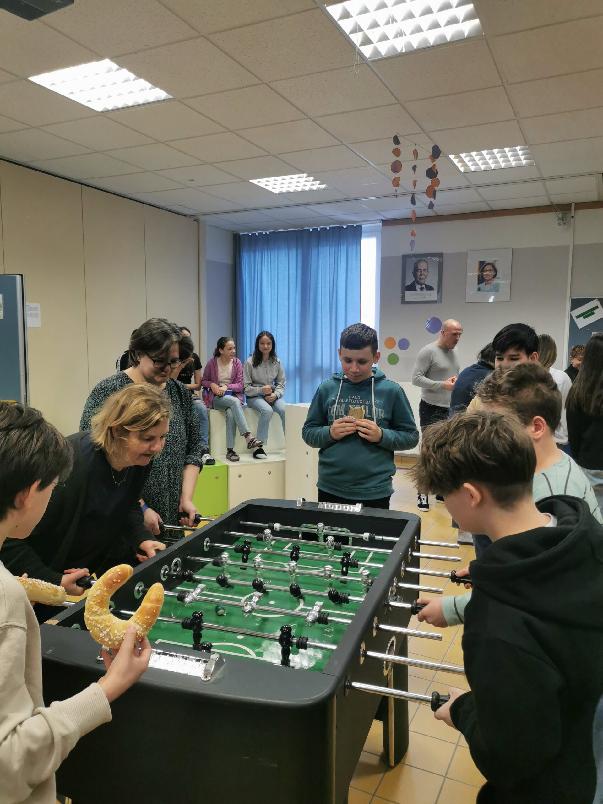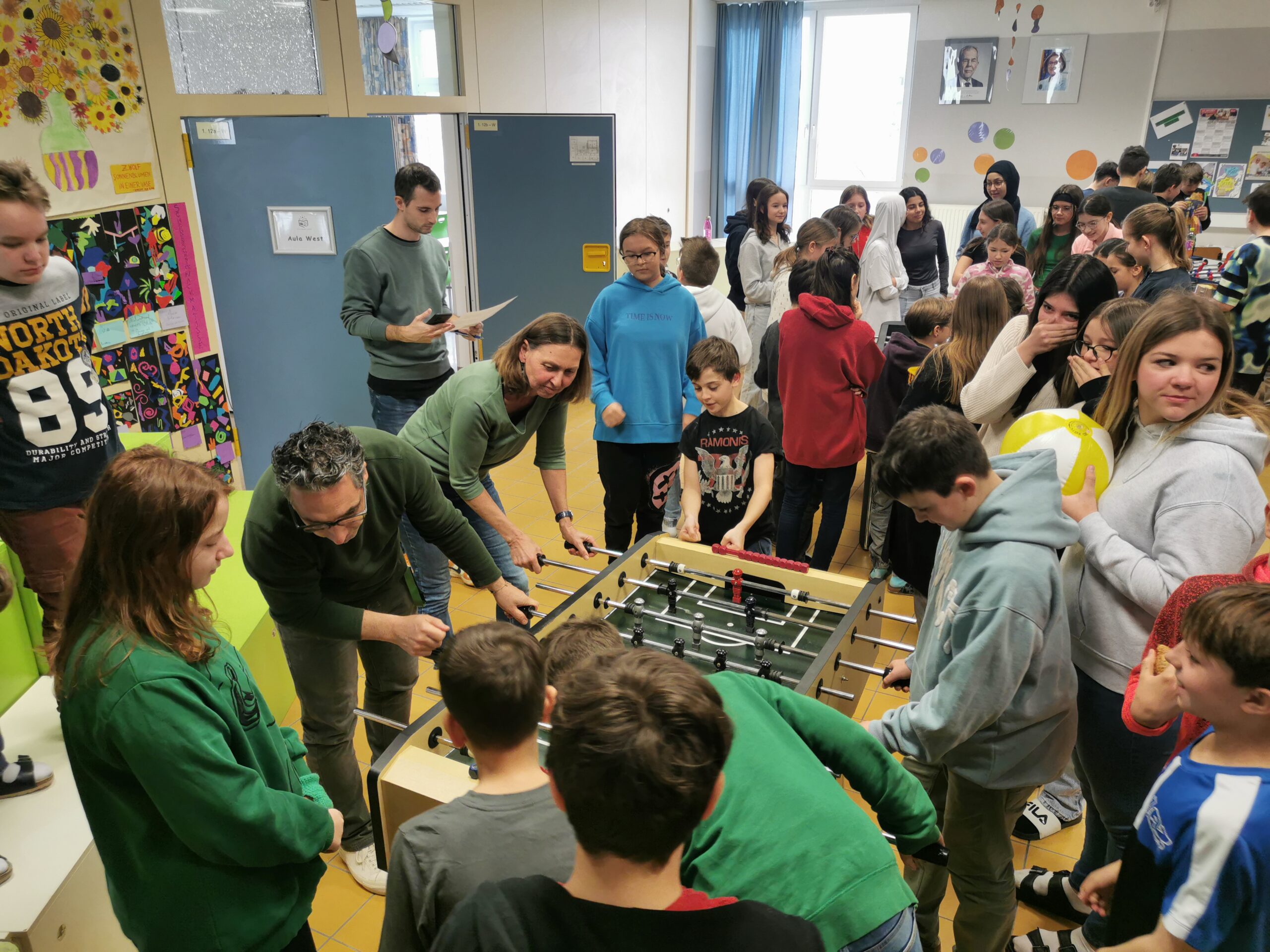 Seit einigen Tagen können sich SchülerInnen und LehrerInnen im Tischfußball beweisen und dadurch ihr Talent in diesem lustigen Spiel unter Beweis stellen. Sogar einige LehrerInnen und Frau Direktorin Smith sowie Sekretärin Jutta Formanek stellten sich der Herausforderung und konnten bereits den ersten Sieg ergattern. In der Aula wird jedenfalls jeden Tag in der großen Pause mitgefiebert, gejubelt und geklatscht. Im Moment befinden sich die Teams noch in der Gruppenphase, um sich fürs Achtelfinale qualifizieren zu können und schlussendlich den heißbegehrten Schulsieg zu ergattern.