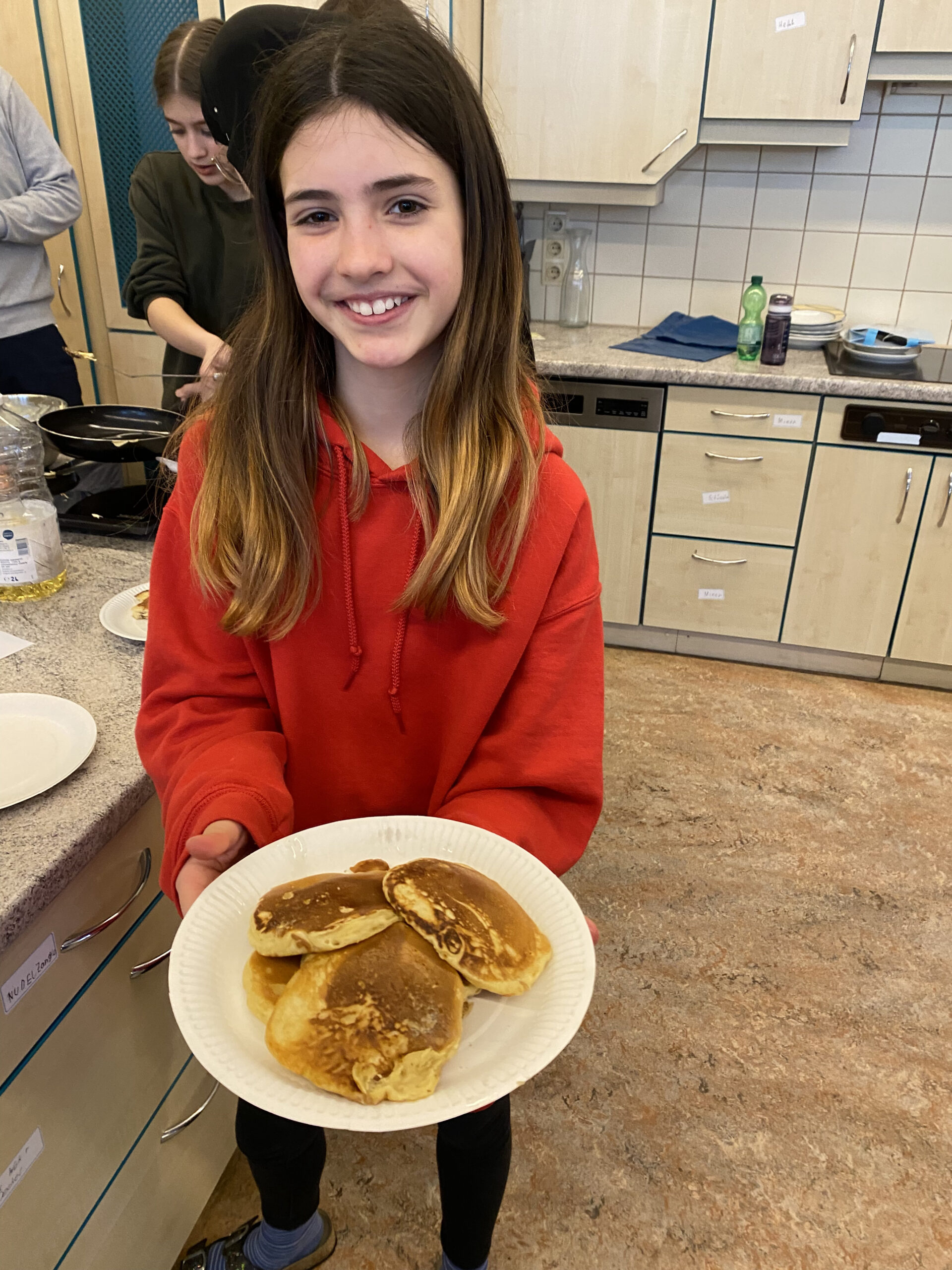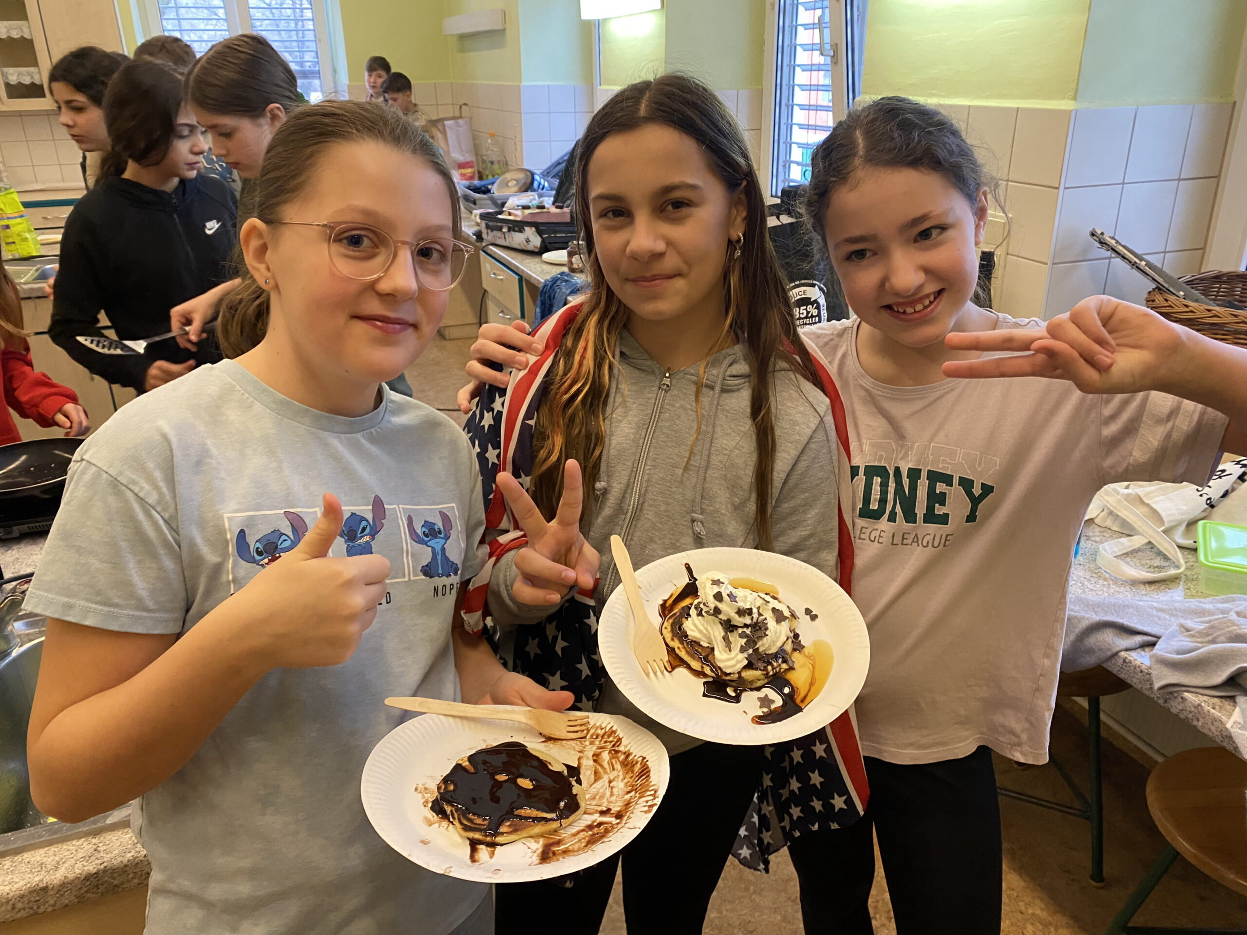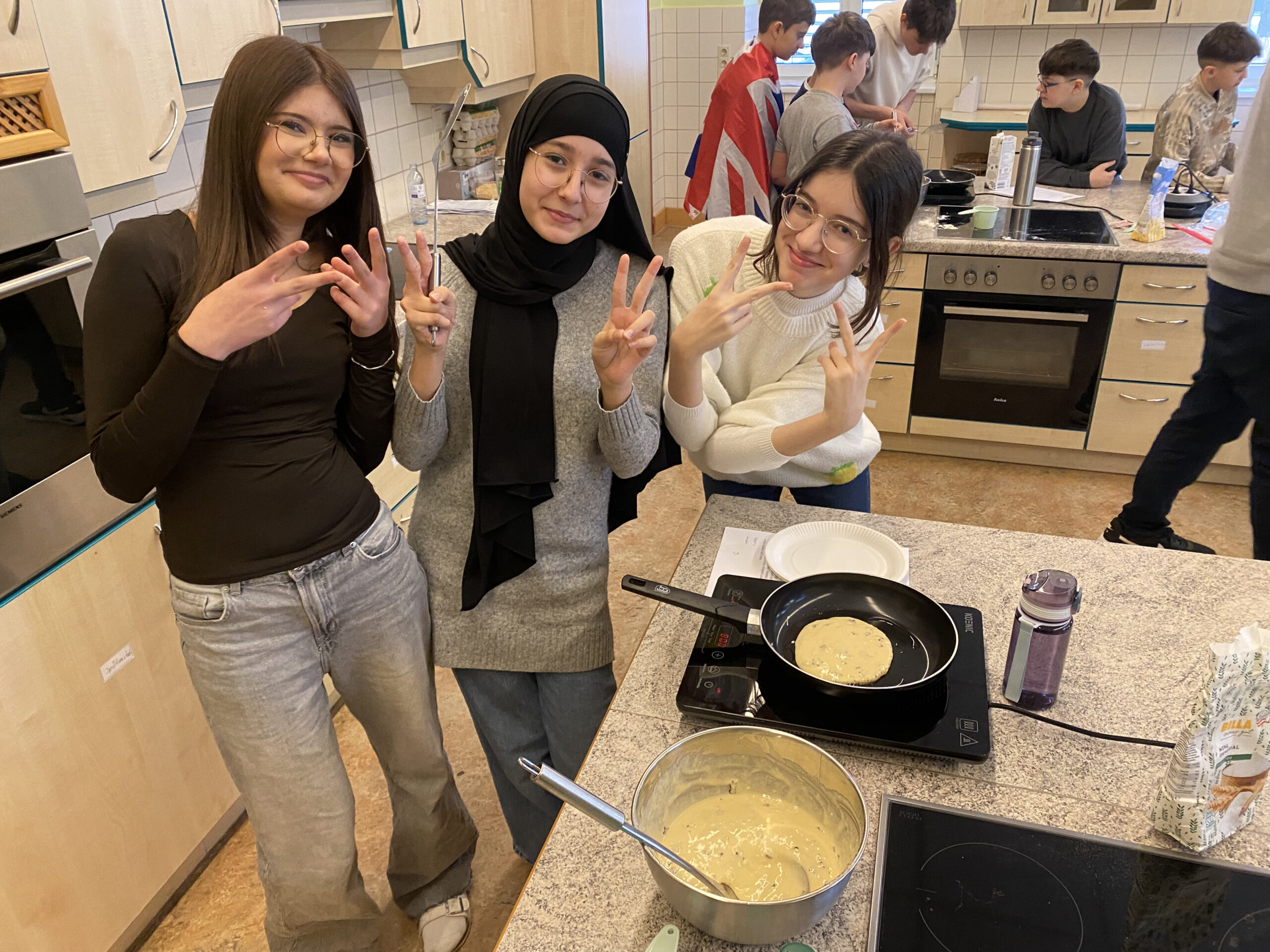 Am Dienstag stand dann ein kulinarisches Highlight auf dem Programm: Gemeinsam mit Mr. Alexander und Mr. Rafael bereiteten die Schüler*innen köstliche American Pancakes zu. Dabei wurde nicht nur gekocht und probiert, sondern auch viel über die Esskultur in den USA gesprochen.