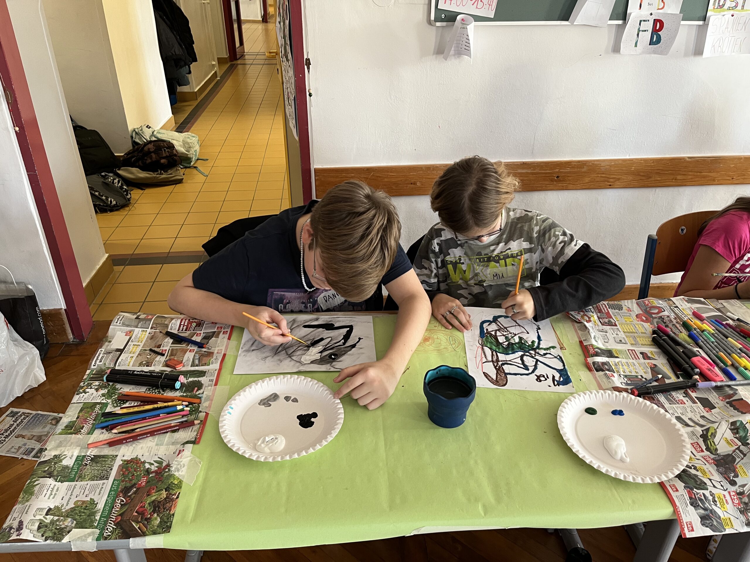 begrüßen: Martina, die die Schüler und Schülerinnen mit viel Fachwissen und Begeisterung in die surrealistische Kunst einführte. Dabei stand das automatisierte Zeichnen zu surrealen Klängen im Mittelpunkt – eine Technik, bei der spontane Gedanken und unbewusste Impulse direkt aufs Papier gebracht werden. Die Schüler und Schülerinnen mussten das darin gefundene Wesen ausarbeiten und weiterentwickeln. So entstanden zahlreiche faszinierende, verträumte und absurde Kunstwerke, mit individuellen Titeln, die die Grenzen der Realität spielerisch hinter sich ließen