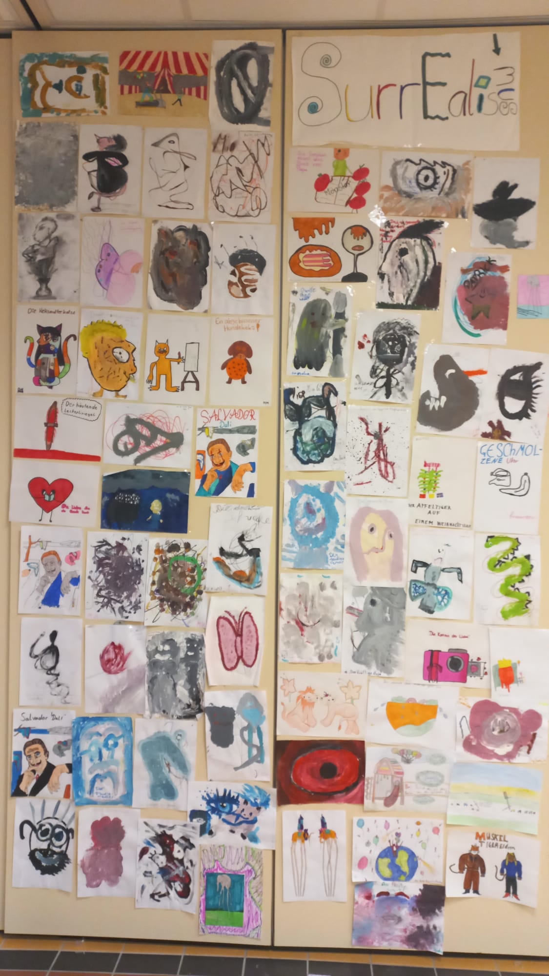 Mit viel Fantasie und Kreativität konnten die Schüler und Schülerinnen ihren Gedanken freien Lauf lassen. Die entstandenen Einzelwerke wurden anschließend zu einem gemeinsamen Klassenkunstwerk auf Leinwand zusammengefügt – ein eindrucksvolles Zeugnis der kollektiven Vorstellungskraft und der Vielfalt surrealistischer Ideen.