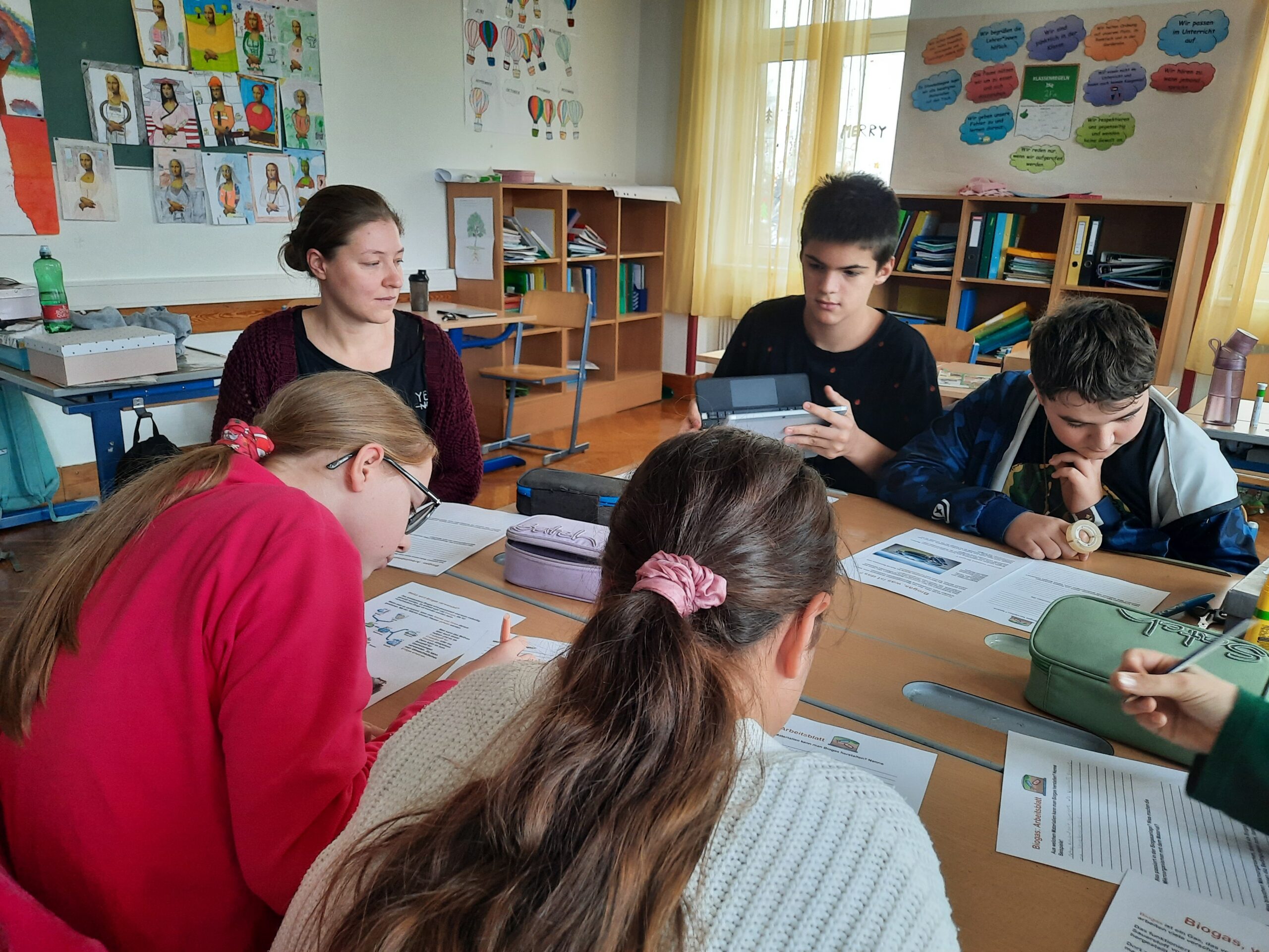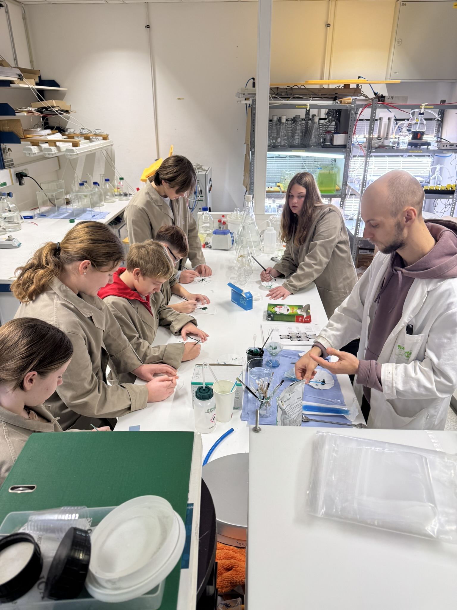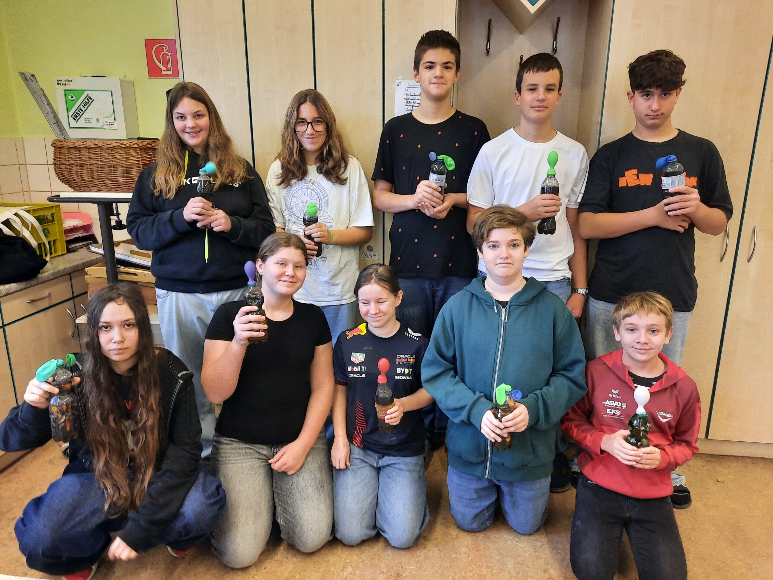 Zum Abschluss reflektierte die 3F die Inhalte und forschte eigenständig weiter. Mit Mikroskopen wurden Proben untersucht, ein Hefe-Experiment zur Gasentwicklung durchgeführt – inklusive leckerer Pizzaschnecken –und in einem zweiten Versuch gezeigt, wie Biogas aus Küchenabfällen entsteht.