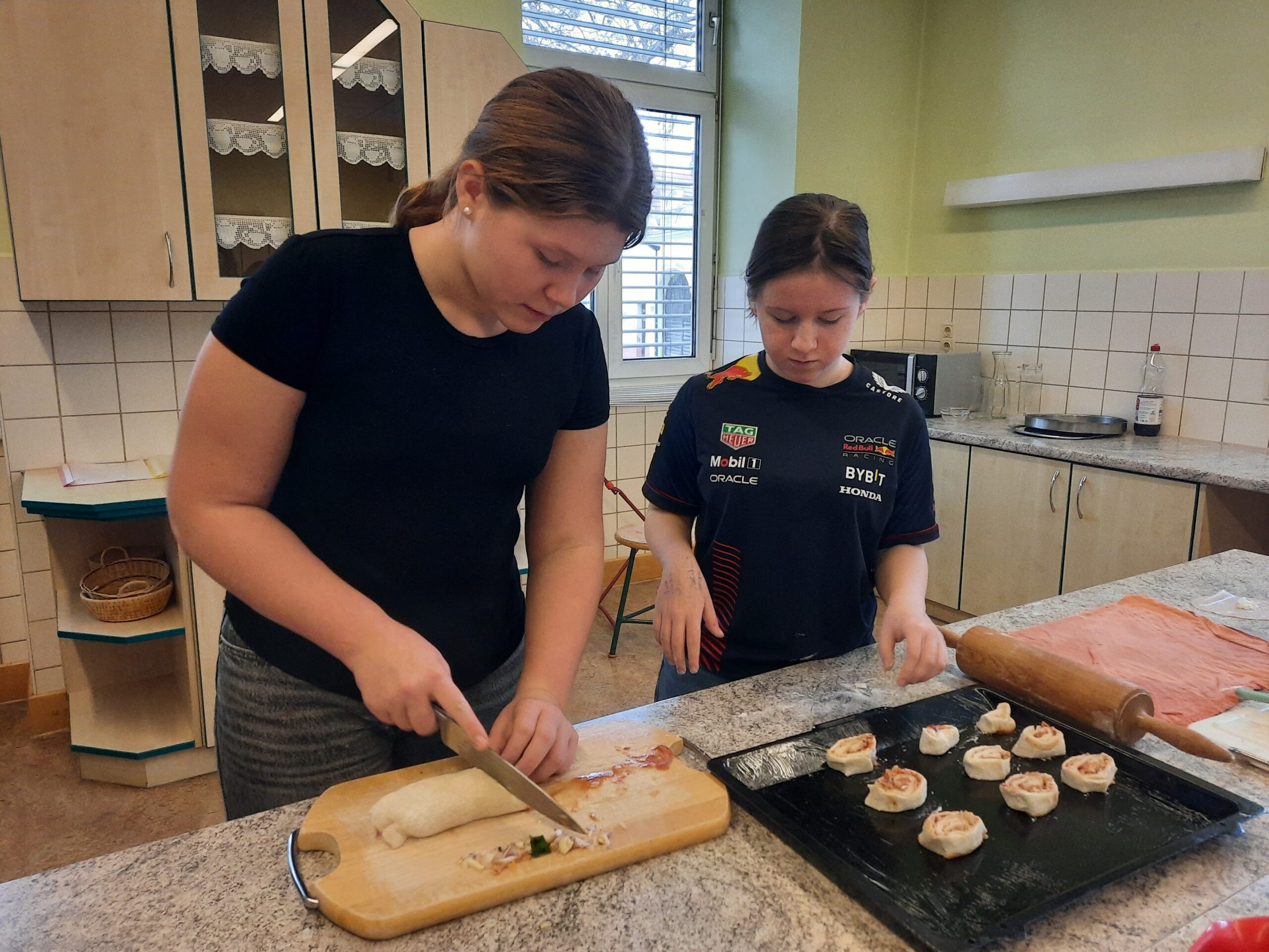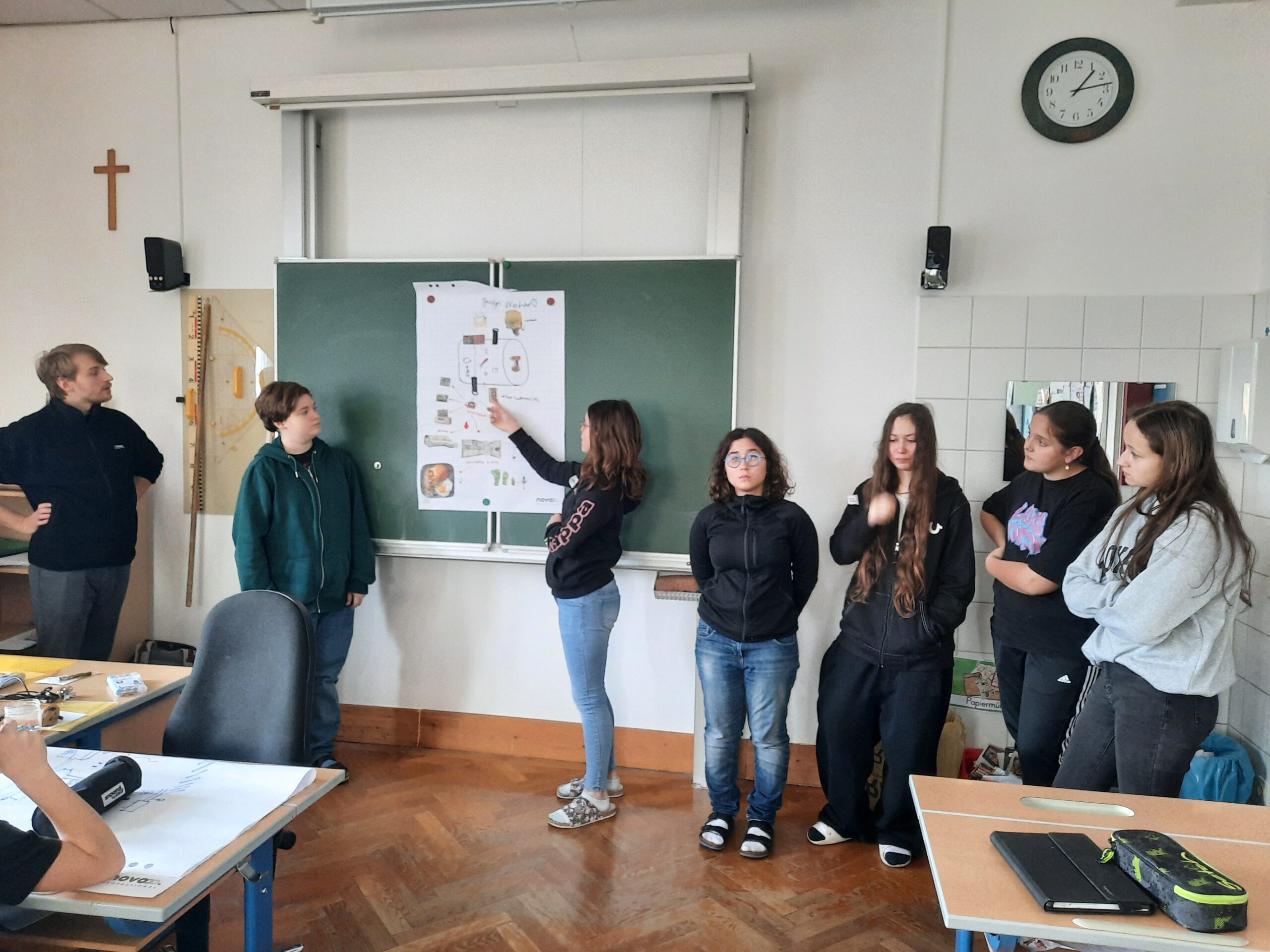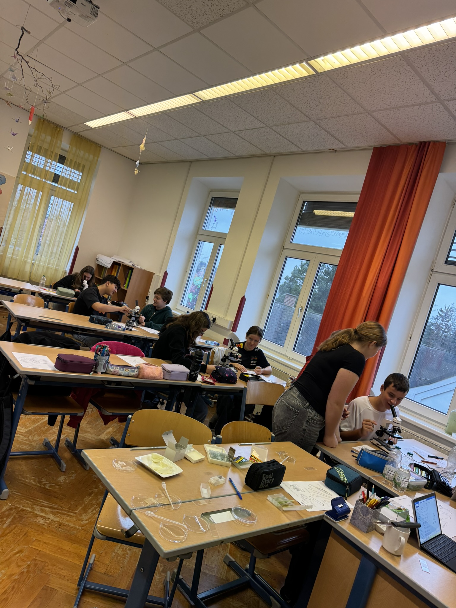 Zum Abschluss reflektierte die 3F die Inhalte und forschte eigenständig weiter. Mit Mikroskopen wurden Proben untersucht, ein Hefe-Experiment zur Gasentwicklung durchgeführt – inklusive leckerer Pizzaschnecken –und in einem zweiten Versuch gezeigt, wie Biogas aus Küchenabfällen entsteht.