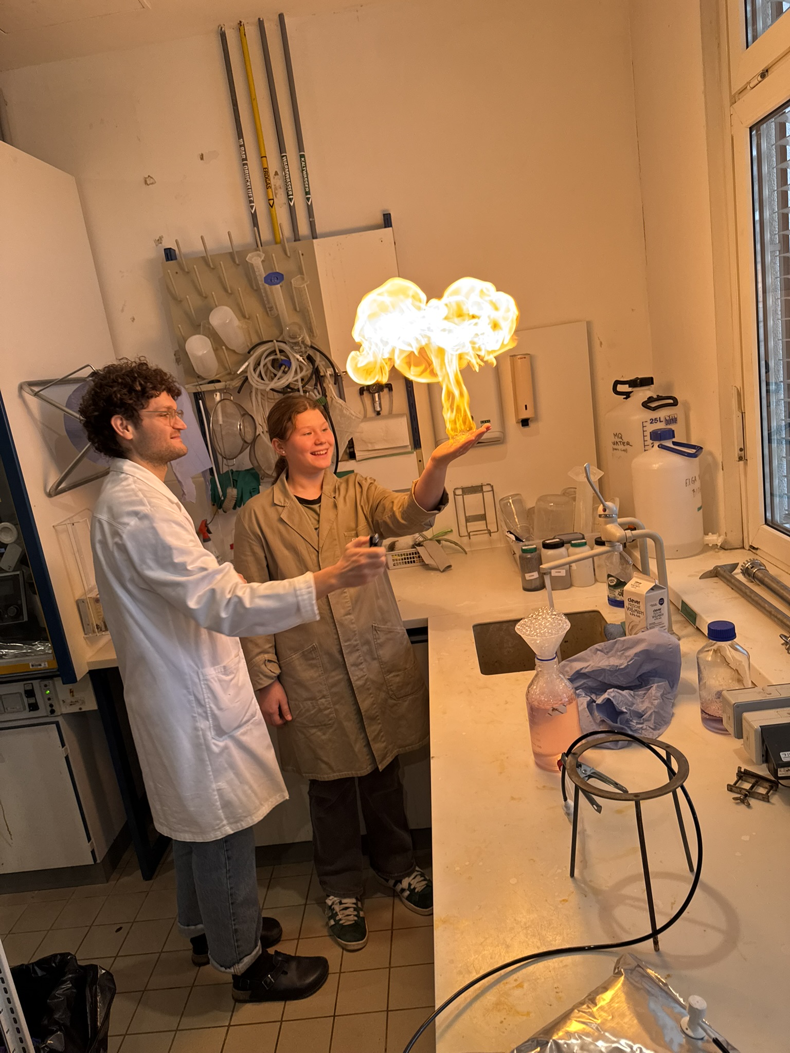 Am zweiten Tag besuchte die Klasse das IFA in Tulln und arbeitete dort im Stationsbetrieb. In vier Gruppen wurden verschiedene Forschungsstationen durchlaufen: Im Biogaslabor wurde die Fest-Flüssig-Trennung untersucht, im Algenlabor Farbstoff aus Spirulina gewonnen und an einer weiteren Station die Funktionsweise einer Biogasanlage, die Kartonabfälle zur Energiegewinnung nutzt, beobachtet. Ein Highlight war die spektakuläre „Methanmamba“-Reaktion, bei der sichtbar wurde, wie sich Methangas entzündet und eine schnelle Flamme entsteht.