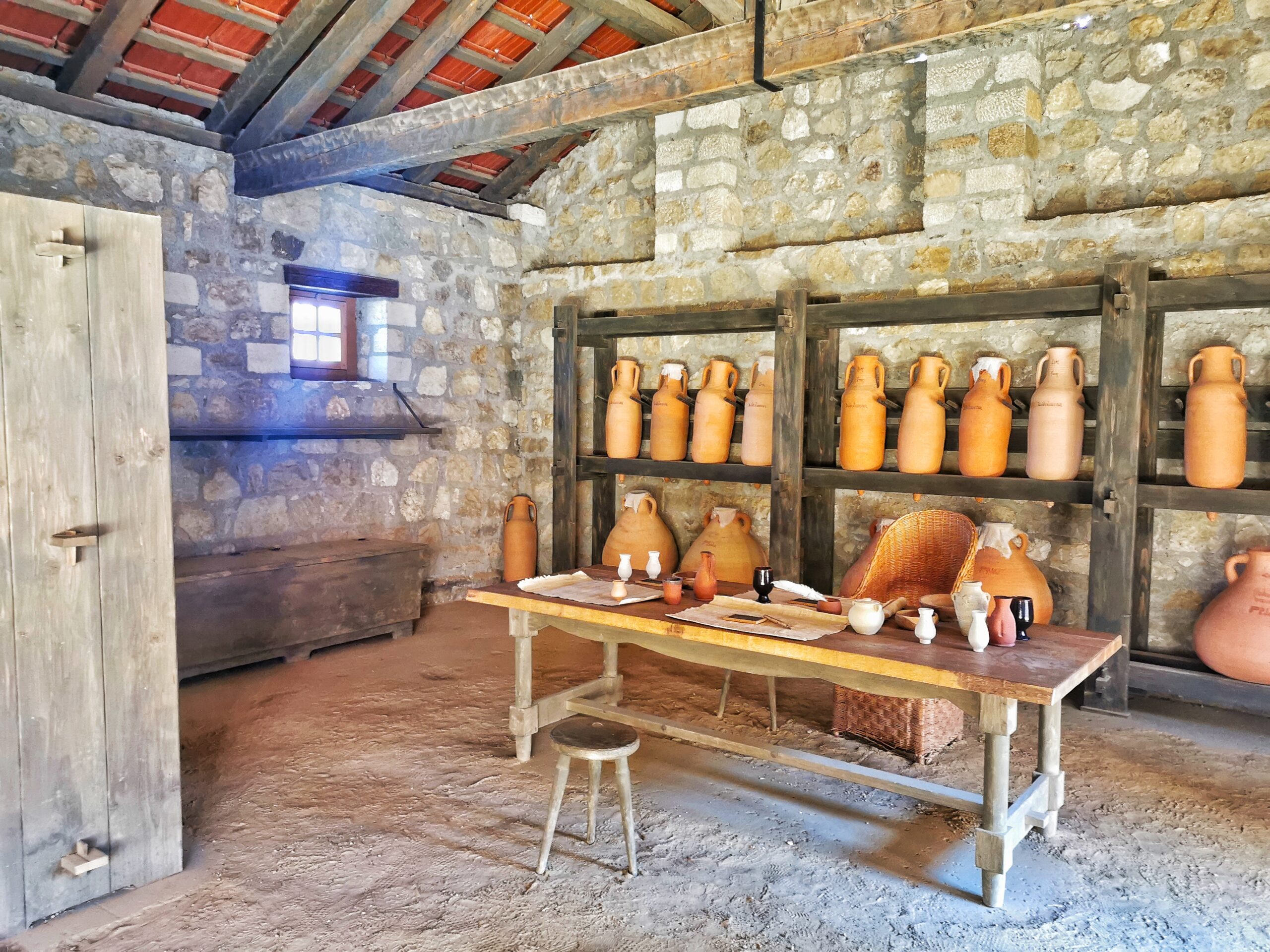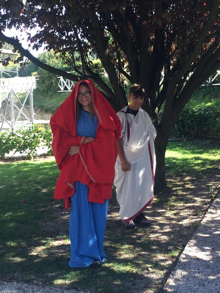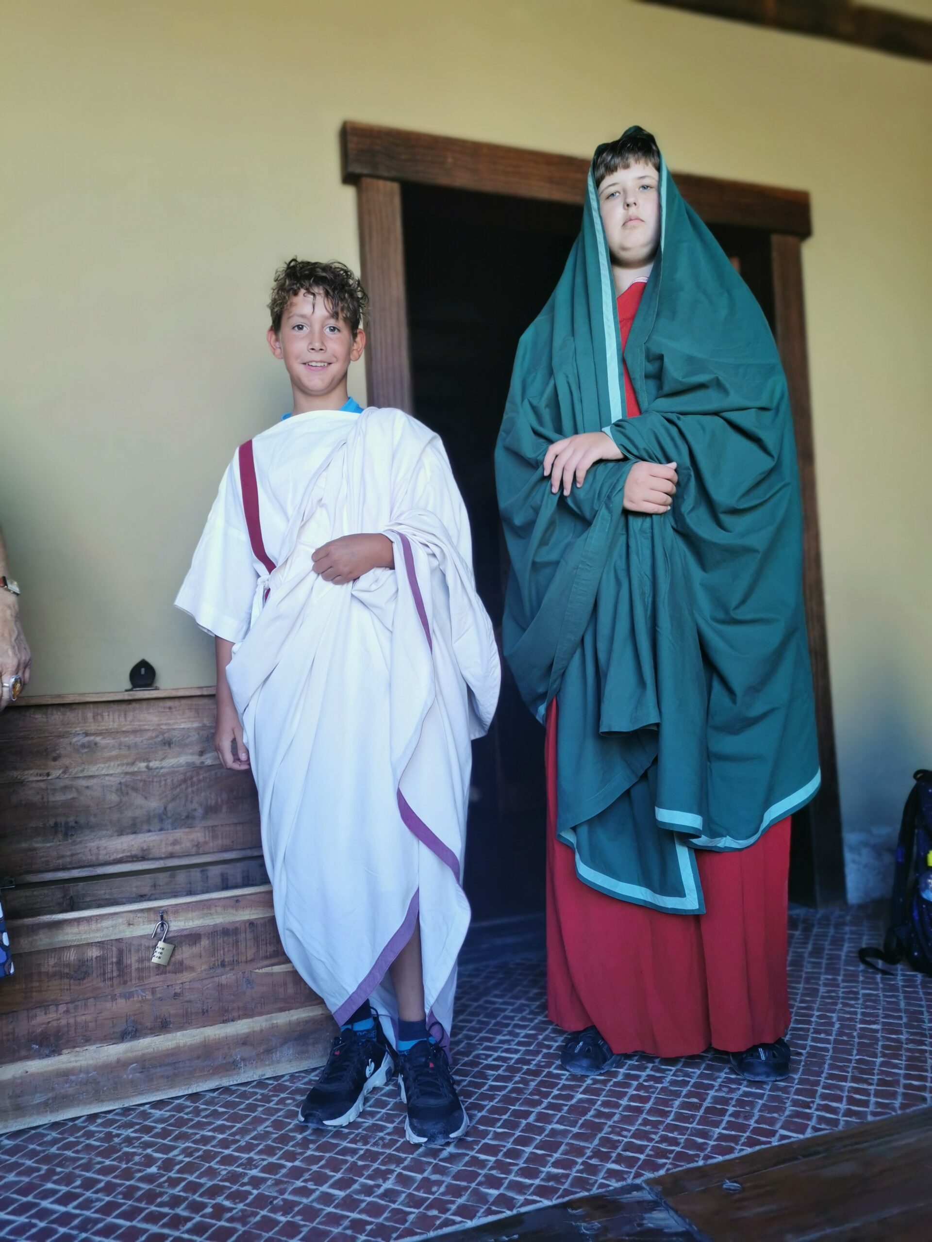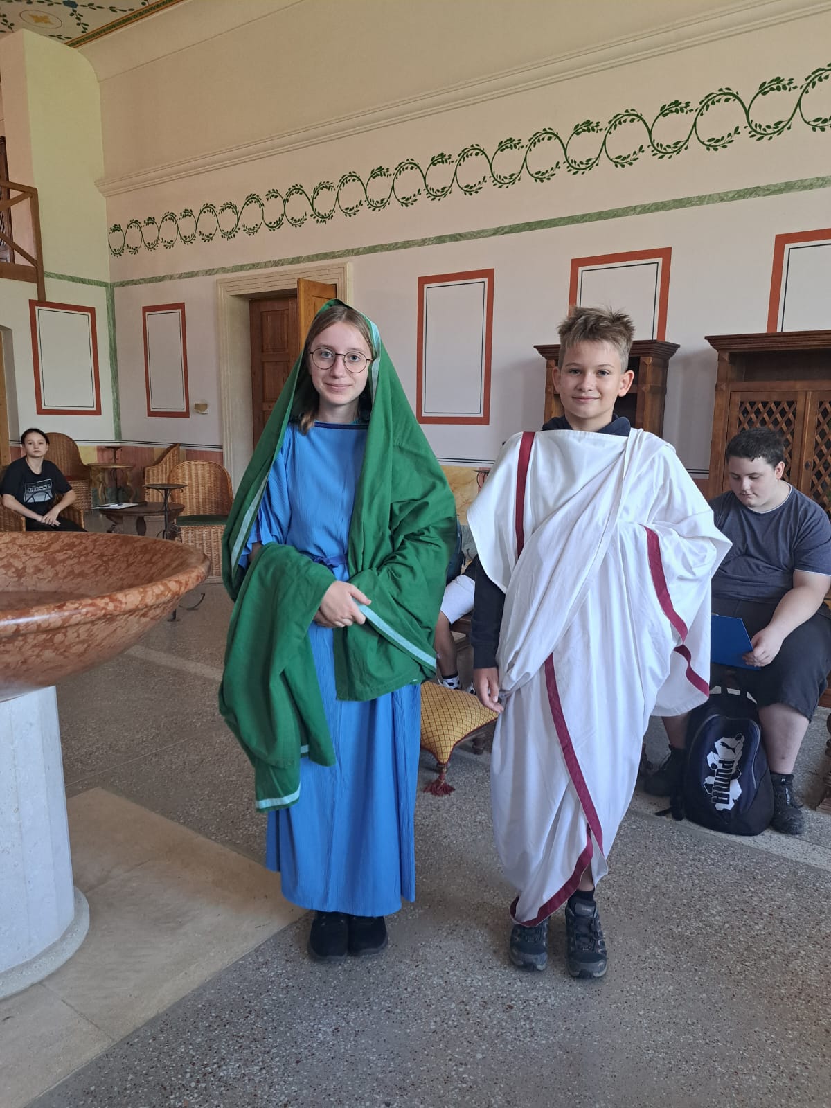 Neben der Funktion von Amphoren und der unbeschreiblichen Technologie der Fußbodenheizung, lernten die SchülerInnen auch etwas über die römischen Schreibutensilien und Beschreibstoffe. Sie durften sogar ausprobieren, wie es sich anfühlt auf einer Wachstafel zu schreiben. Manche SchülerInnen kamen sogar in den Genuss das klassische römische Kleidungsstück, die Tunika, anzuprobieren.